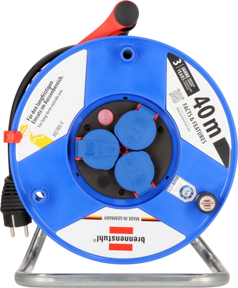 - Cable alargador enrollable para el uso universal en exteriores en la industria o construcción con un cable extensible de tipo RN de longitud de 40 m (H07RN-F 3G1,5)