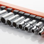 - Juego de llaves de vaso de 1/4” de 10 piezas en soporte regleta de plástico.