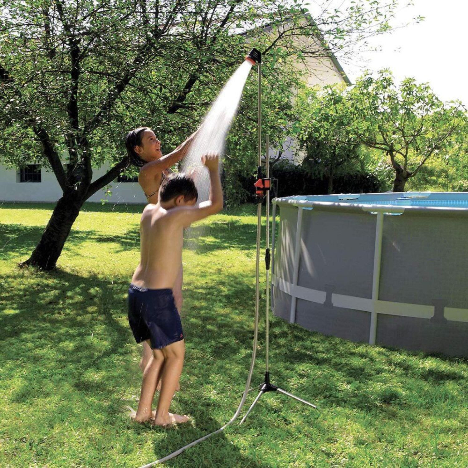 - Refrescante ducha con trípode de soporte, ocupa poquísimo espacio. Lista para usar, es ideal para el jardín, la terraza, el borde de la piscina y para campismo.