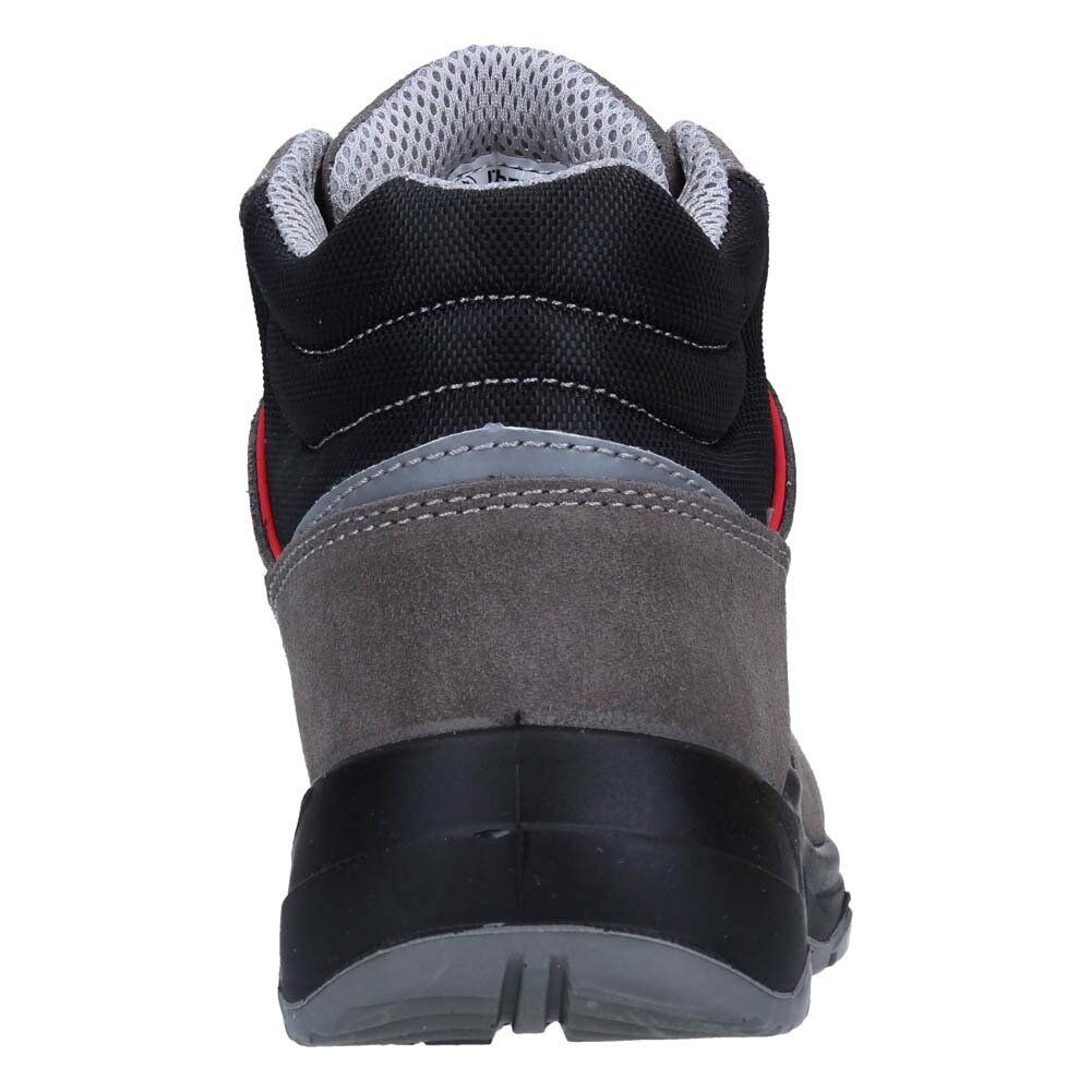 Calzado de seguridad gris, con detalles en negro y rojo, ligero y flexible, con horma ancha, lo que hace que sea un calzado cómodo.