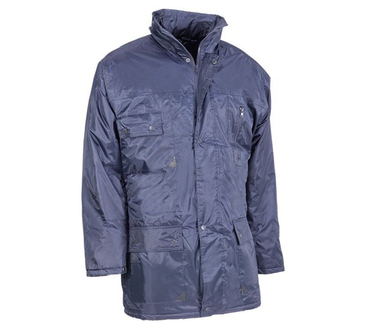Cuatro bolsillos exteriores y uno interno. Capucha interna con cierre de cremallera. Poliéster sobre recubrimiento de PVC con acolchado y forro de poliéster.